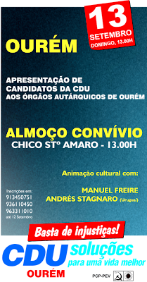 Sobre a CDU, modestamente, como teria de ser, a informação de que apresenta candidatos autárquicos (ao lado não da dra. Ferreira Leite e do prof, doutor Augusto Mateus, na página respectiva, mas noutra página e ao lado da "gripe A em sessão de esclarecimento em Ourém").